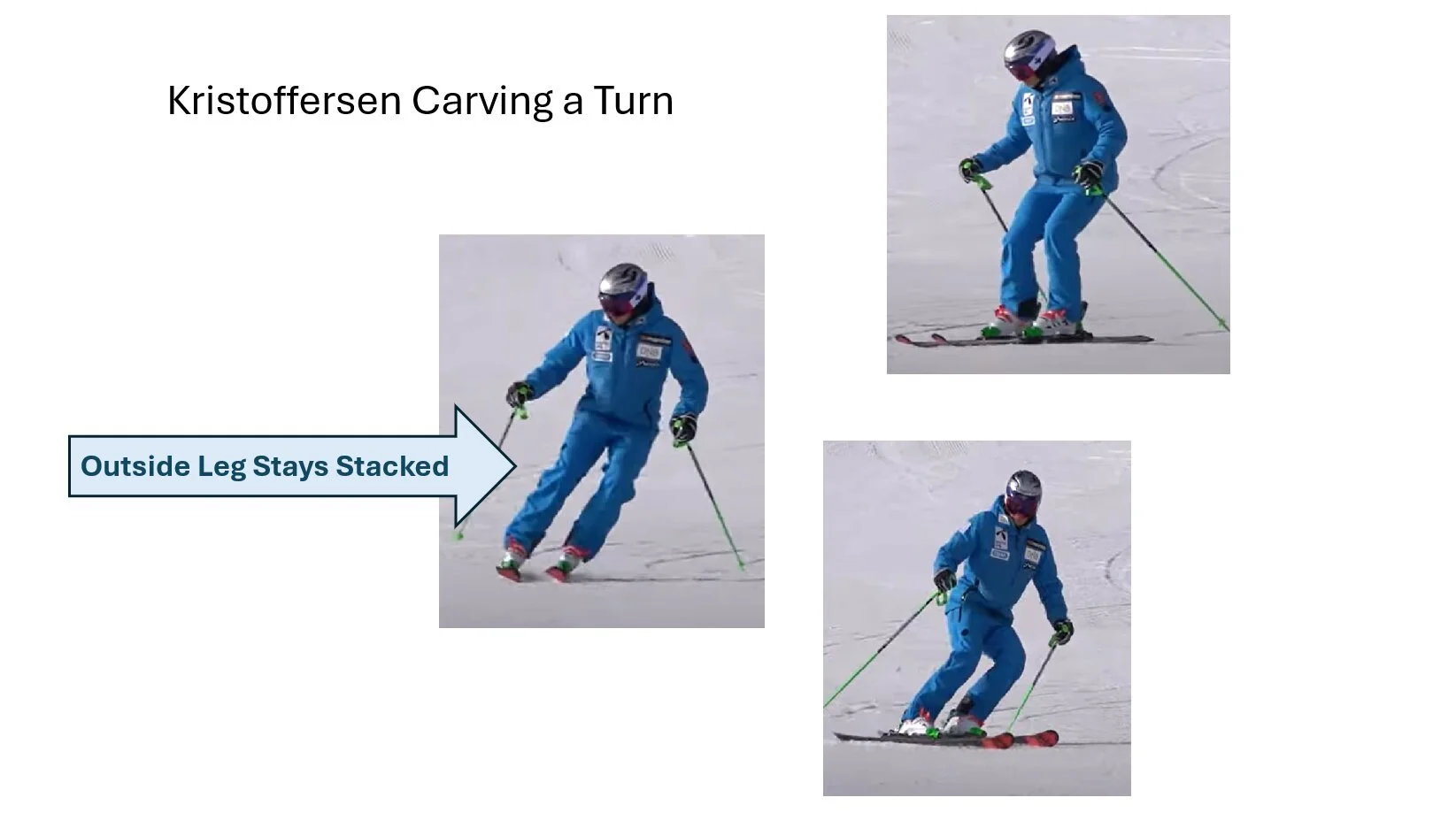 Watch a few turns of Henrik Kristoffersen in this video. Observe how his new outside leg is stacked, while his outside knee remains stable and does not tip inward.