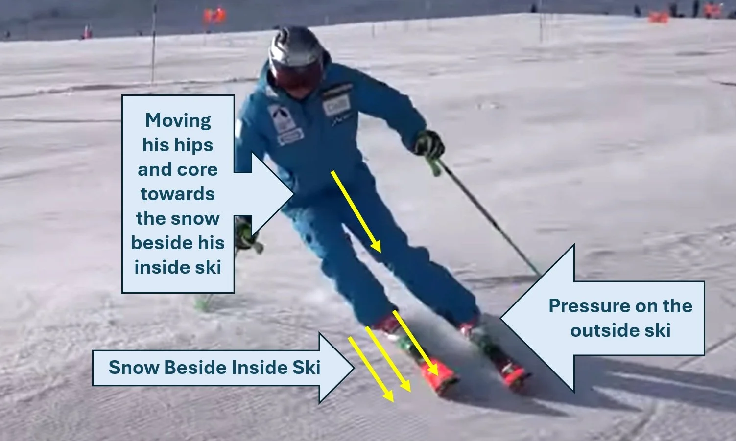 Movement 3: Move move your core and hips towards the snow beside your inside ski. Feel pressure increase against your outside ski.