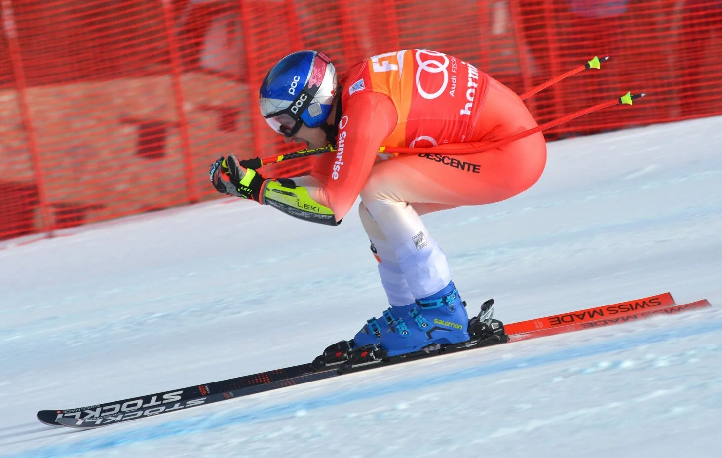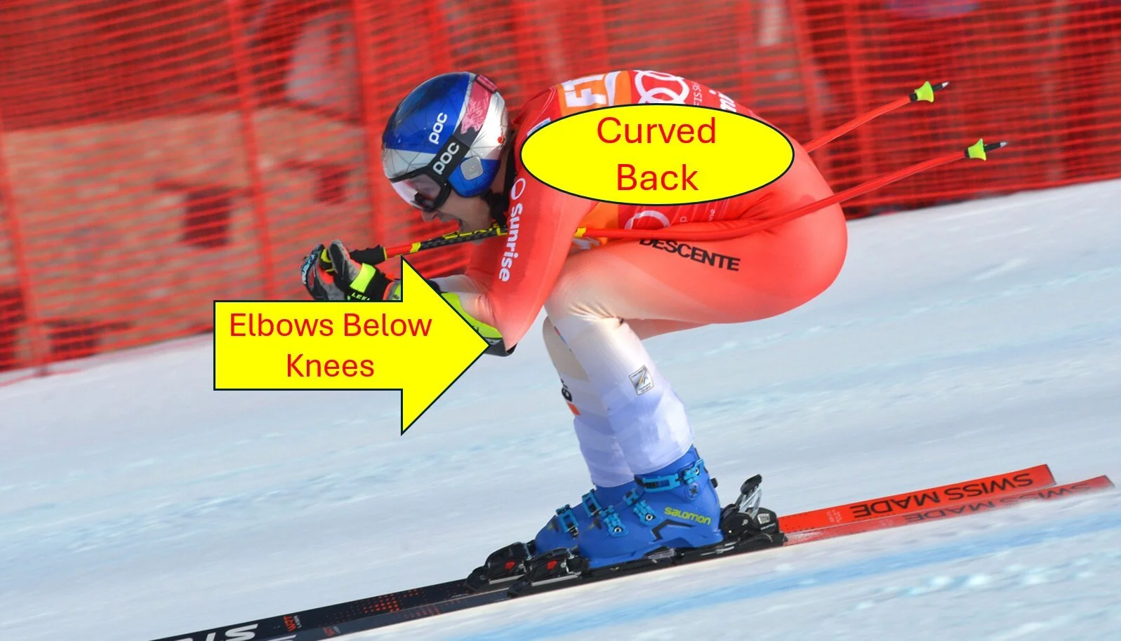 In this video, watch the first skier execute a clean carved turn in a high tuck stance, with her hips and shoulders aligned with the direction of the turn.